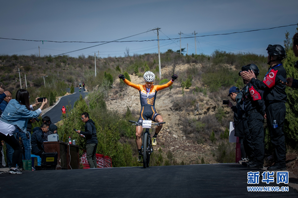 Arms aloft, a delighted cyclist celebrates his arrival at finish line of the third National Mountain Cycling Open in Gaoping, Shanxi province, on April 13. [Photo/Xinhua]
