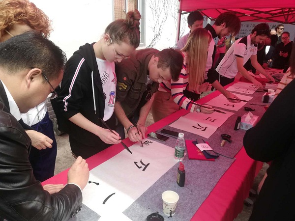 Italian students learn how to write with a Chinese brush. [Photo provided to chinadaily.com.cn]
