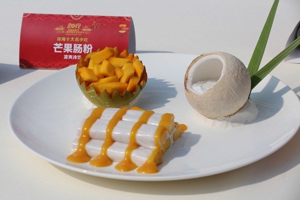Hainan Mango Roll consists of fresh juicy slices of fresh Hainan mango wrapped in a delicate rice noodle wrapper, and topped with a drizzle of mango juice.