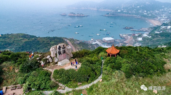 In the southern part of Gouqi island, there is a majestic cliff standing at the peak of Wulixi Hill. The east side engraves a few giant characters stating "Wonders of Mountains and Sea." Each word is 1.6 meters high and 1.3 meters wide.