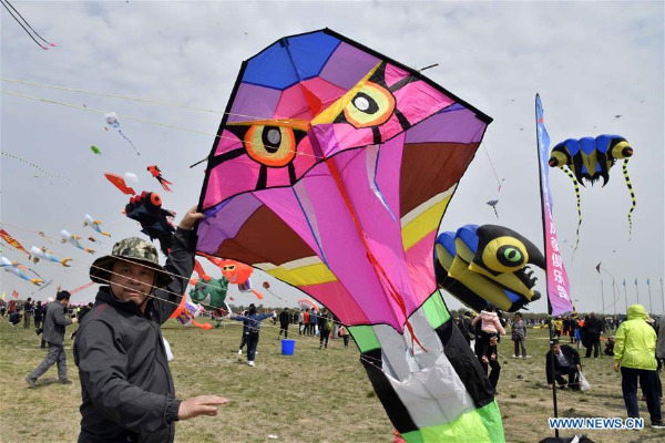 Kite enthusiasts fly their kites at the opening ceremony of the 36th Weifang International Kite Festival in Weifang, East China's Shandong province, April 20, 2019. [Photo/Xinhua]