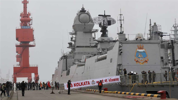An Indian Navy frigate arrives at the port in Qingdao for the upcoming joint sea parade, in East China's Shandong province, April 21, 2019. [Photo by Xu Jingxing/chinadaily.com.cn]