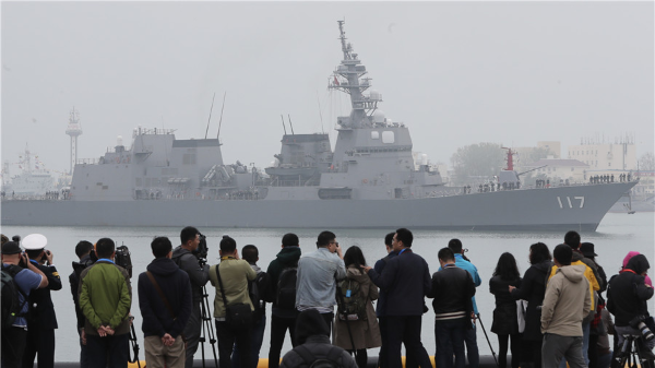A frigate from Japan arrives at the port in Qingdao for the upcoming joint sea parade, in East China's Shandong province, April 21, 2019. [Photo by Xu Jingxing/chinadaily.com.cn]