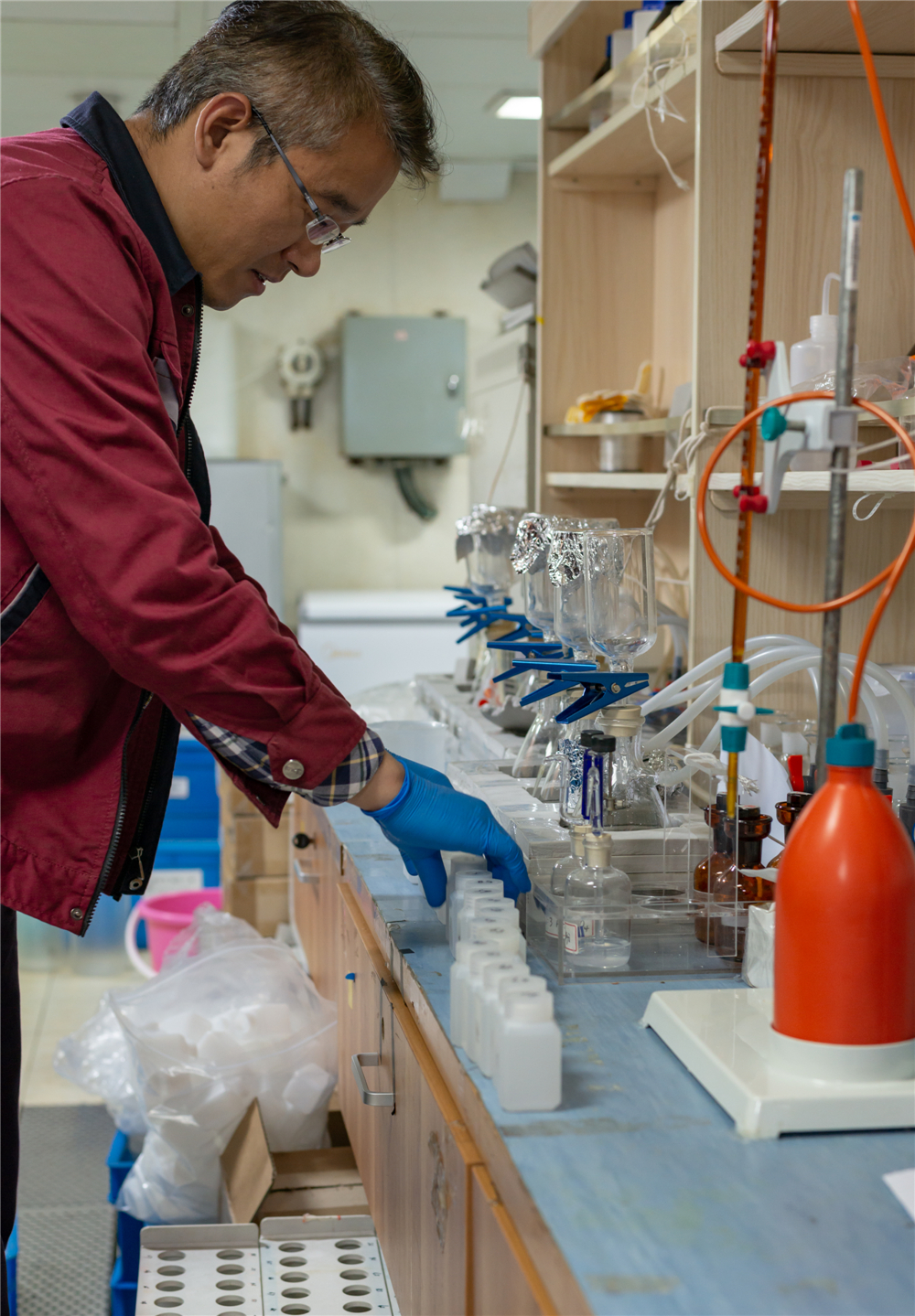 A researcher handles a water sample in a laboratory onboard Dayang Yihao, April 17, 2019. [Photo by Liu Chenggang/Provided to chinadaily.com.cn]