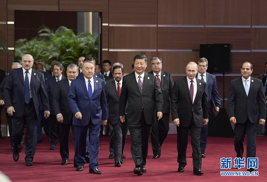 President Xi Jinping and foreign leaders enter the China National Convention Center to attend the opening ceremony of the Second Belt and Road Forum for International Cooperation in Beijing on April 26, 2019. [Photo/Xinhua]