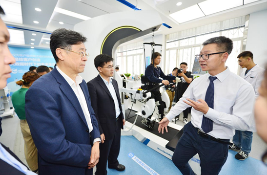 Technicians introduce the functions and use of rehabilitation training robots to launching ceremony participants. [Photo provided to chinadaily.com]