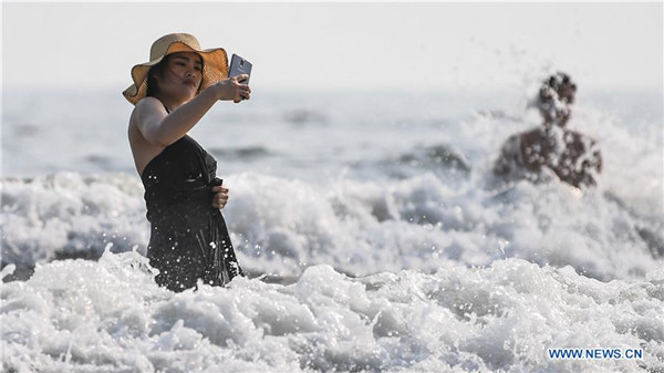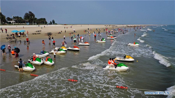 Photo taken on April 17, 2019 shows tourists in Sanniangwan scenic spot in Qinzhou, south China's Guangxi Zhuang Autonomous Region. The tourism of Beibu Gulf has developed rapidly in recent years. [Photo by Zhang Ailin/Xinhua]