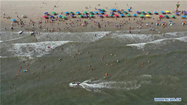 Aerial photo taken on April 18, 2019 shows tourists playing in Silver Beach of Beihai, south China's Guangxi Zhuang Autonomous Region. The tourism of Beibu Gulf has developed rapidly in recent years. [Photo by Zhang Ailin/Xinhua]