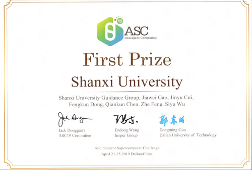 Shanxi University won first place at the finals for the 2019 ASC Student Supercomputer Challenge at Dalian University of Technology on April 25.