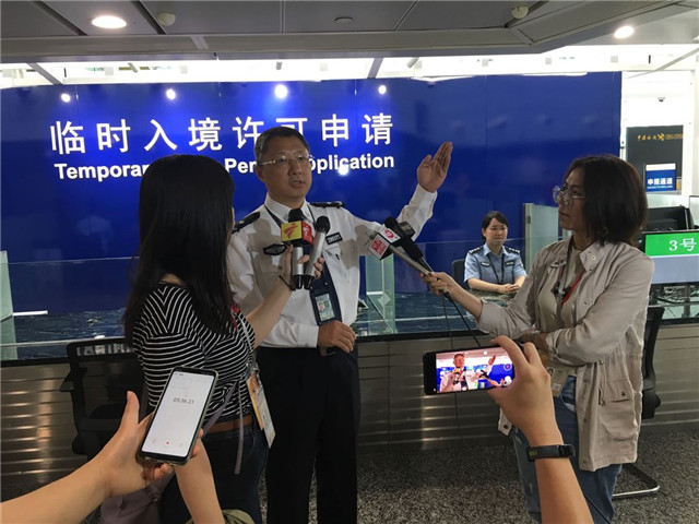 Chen Jin, a senior executive frontline police officer from Guangzhou International Airport, answers questions from the media. [Photo by Zheng Caixiong/chinadaily.com.cn]