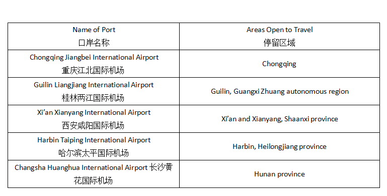 Ports for 72-hour visa exemption and areas open to travel