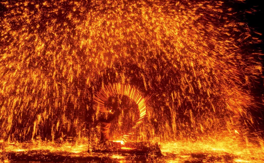 (a shower of molten iron sparks that looks like fireworks) in Yuxian county, Zhangjiakou city, North China's Hebei province. [Photo by Leng Xinyu/provided to chinadaily.com.cn]