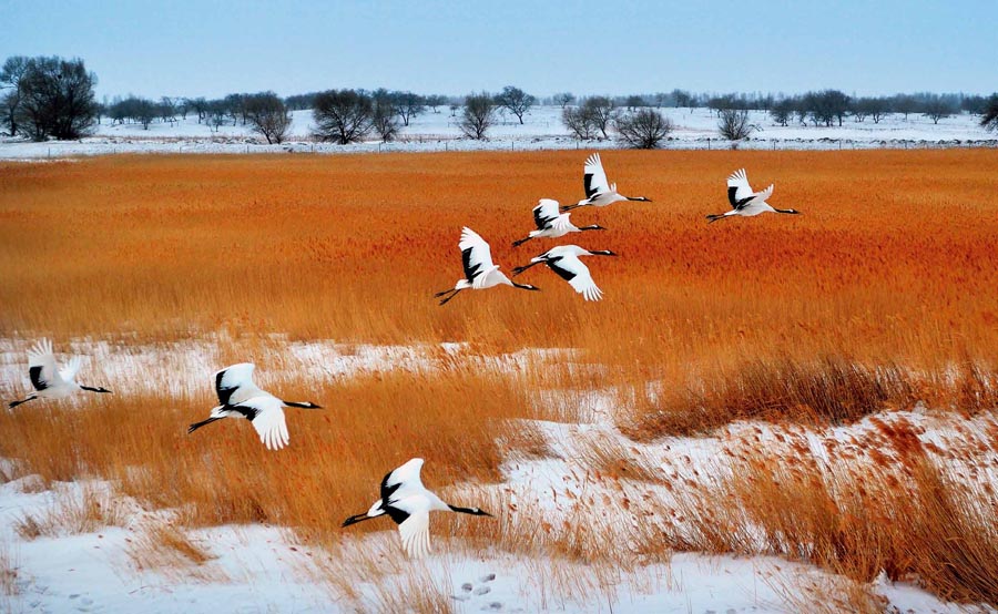 Red-crowned cranes at Xianghai National Nature Reserve in Baicheng city, Northeast China's Jilin province. [Photo by Lin Haizhong/provided to chinadaily.com.cn]