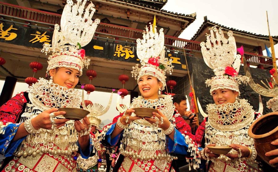 A welcoming ceremony of the Miao people in Qiandongnan Miao and Dong autonomous prefecture, Southwest China's Guizhou province. [Photo by Li Guiyun/provided to chinadaily.com.cn]