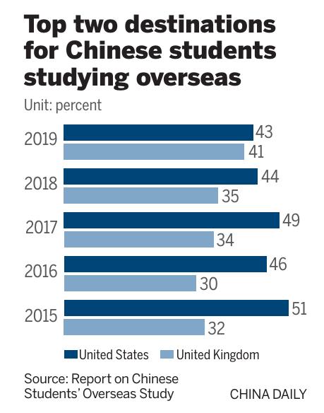 US dominance looks uncertain as the number of students inclined to study in the UK rose sharply in 2019, accounting for 41 percent, up 9 percentage points compared with 2015.
