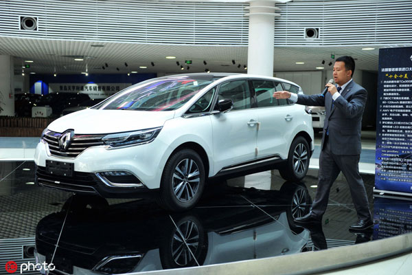 A compere introduces a Renault car imported from France at a news conference at Qingdao Free Trade Port Area in Shandong province on March 30. [Photo/IC]