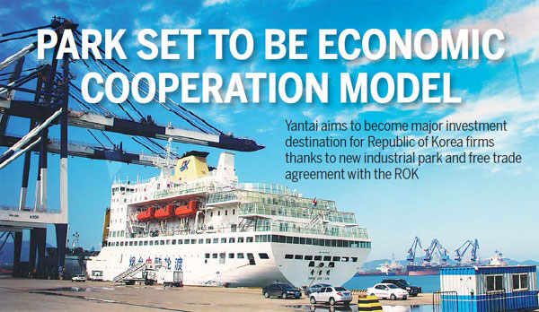 A ferry at the Sino-ROK Industrial Park in Yantai, East China's Shandong province, vows to improve its services from Yantai to South Korea. The park was jointly launched by Sino-Korean presidents and those involved in Sino-Korea FTA framework developed by the two countries. [Photo by Wang Qian/China Daily]