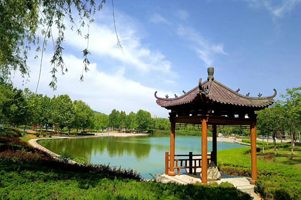 A lake surrounded by lush green plants, with an antique pavilion is a beautiful site on the campus of Shandong University of Traditional Chinese Medicine. [Photo/sdutcm.edu.cn]