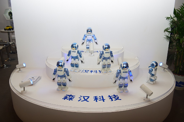 Robots of Senpower are showcased at the company's booth at the AI Expo 2019 in Suzhou, East China's Jiangsu province, on May 9, 2019. [Photo/VCG]