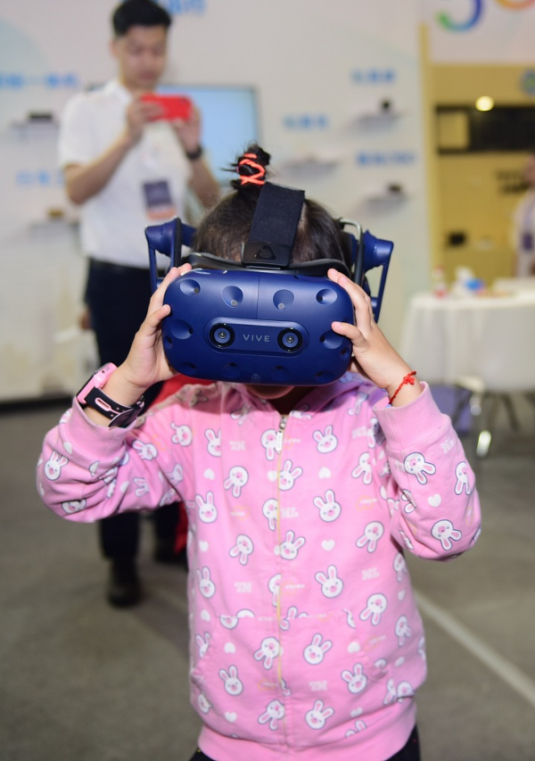A child tries the VIVE VR glasses at the AI Expo 2019 in Suzhou, East China's Jiangsu province, on May 9, 2019. [Photo/VCG]
