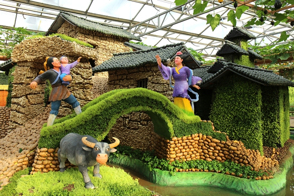 The rural life scene made of vegetables and plants is displayed at the 19th China (Shouguang) International Vegetable SciTech Fair held in Shouguang, East China's Shandong province from April 20 to May 20, 2018. [Photo/sgcbh.com]