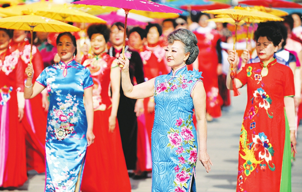 Women dressed in the qipao (the traditional Chinese dress) parade at a fashion show in Taiyuan, Shanxi province, on May 12. Some 1,000 women qipao enthusiasts, aged between 55 and 76 from local 100 communities, took part in the qipao show to mark Mother's Day. [Photo/Shanxi Daily]