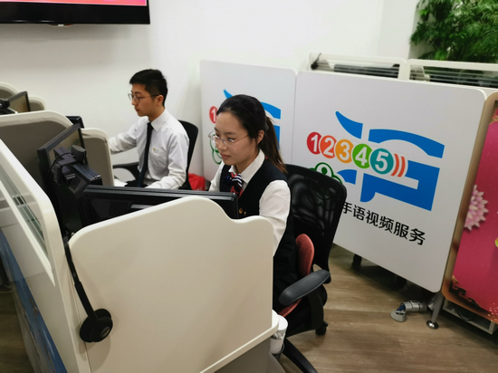 Operators communicate with hearing-impaired people through a camera and display device. [Photo by Ju Yunpeng/for chinadaily.com.cn]