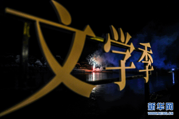 A fireworks show adds excitement to the literary event in Qikou ancient town. [Photo/Xinhua]