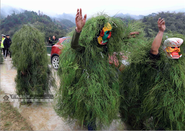 Wearing the “Manghao” mask and miscanthus on their body with hands and feet painted black, these youngsters dress up as the “Manghao” to deliver good wishes for the Spring Festival. [Photo by Tan Kaixing/gxnews.com.cn]