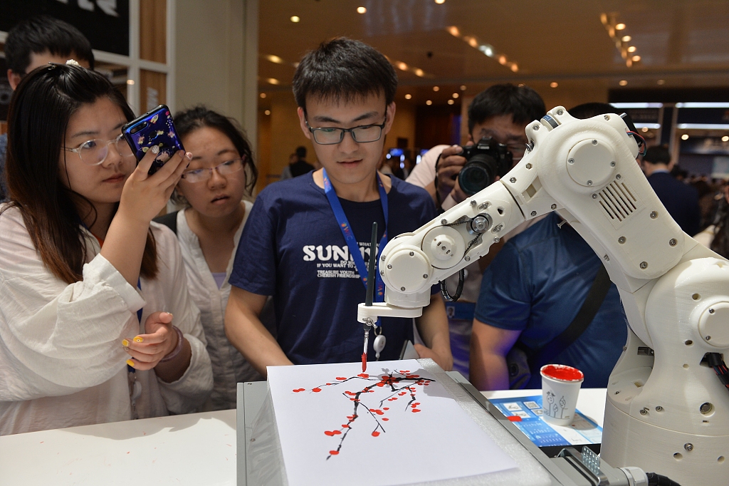 Visitors watch a robot draw plum blossoms at the third World Intelligence Congress in Tianjin, on May 16, 2019. [Photo/VCG]