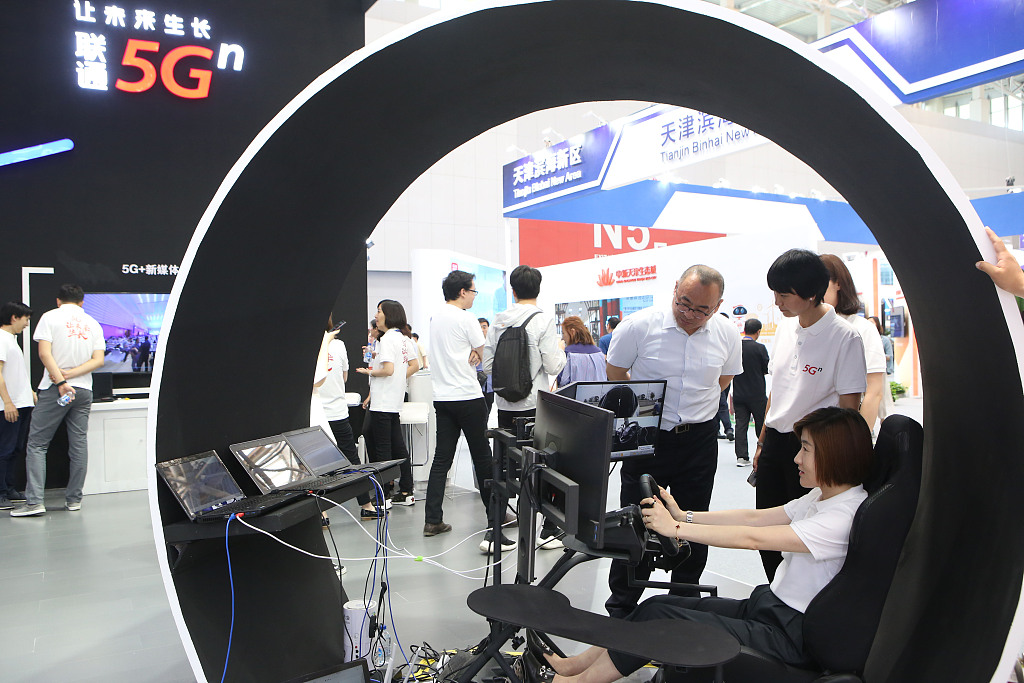 Visitors experience 5G technologies at the third World Intelligence Congress in Tianjin, on May 16, 2019. [Photo/VCG]