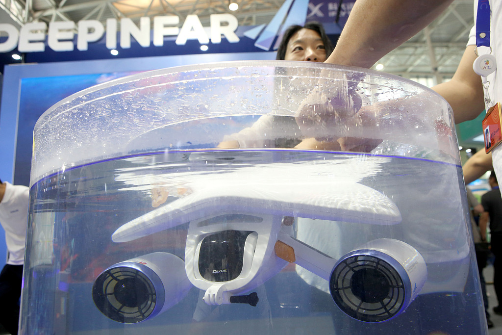 An underwater intelligent equipment is seen at the third World Intelligence Congress in Tianjin, on May 16, 2019. [Photo/VCG]