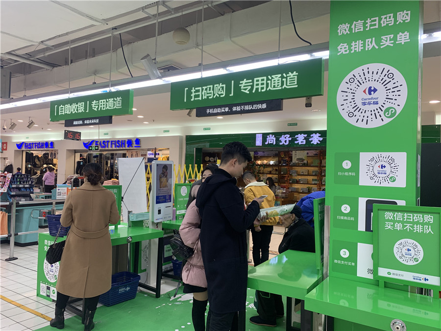 To be more specific, the function enables customers to scan the bar code on items and bag these goods, including produce, while they shop and pay directly with their smartphones, according to a press release from WeChat.