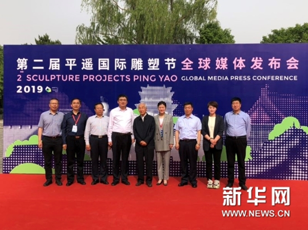 Guests pose for a photo at the press conference for the 2nd Sculpture Projects Ping Yao in Beijing, on May 15. [Photo/Xinhua]
