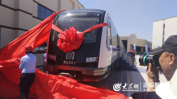 The first train of Jinan metro line 3 is unveiled in Licheng district of Jinan, Shandong province on May 20. Metro line 3 is expected to start trial operation this October. [Photo/dzwww.com]