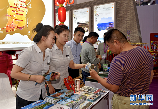 A visitor glances through a brochure at the exhibition area of Shanxi province during the expo in Nanchang, Jiangxi province, on May 18. [Photo/Xinhua]