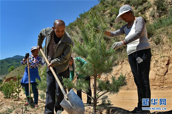 Villagers from Huili village plant trees at the foot of Lyuliang Mountain in Lanxian county, Shanxi province, on May 26, 2017. Shanxi has successfully completed an afforestation area of some 2,666 square km annually. [Photo/Xinhua]
