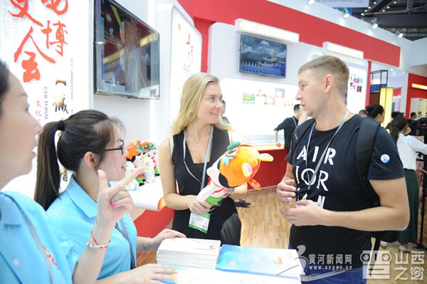 A couple from overseas find something of interest in the exhibition area for Shanxi province at the cultural industries fair in Shenzhen, on May 16. [Photo/sxgov.cn]