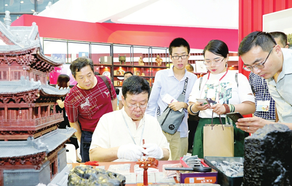 Visitors take in the precise skills that go into making a miniature wooden model of an ancient building at the fair in Shenzhen, on May 16. More than 200 arts and crafts in 20 categories from 18 exhibitors from Shanxi were displayed at the fair. [Photo/Shanxi Daily]