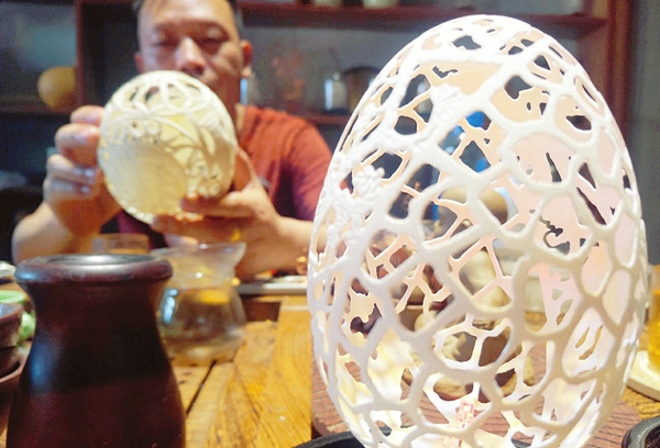 Craftsman Kong Bin carves eggshells in Yaodu district, Linfen city, Shanxi province, May 23. He has been devoted to eggshell carving since he was a child and won gold at the Shanxi Provincial Culture Industry Expo. He is now creating eggshell carvings to promote traditional culture in Linfen city. Eggshell carving, a tradition that originated from the custom of giving carved eggs as gifts at festivals, ceremonies, and parties, is often called "the most fragile art" as it requires extreme precision and care during and after the carving process. [Photo/Shanxi Daily]