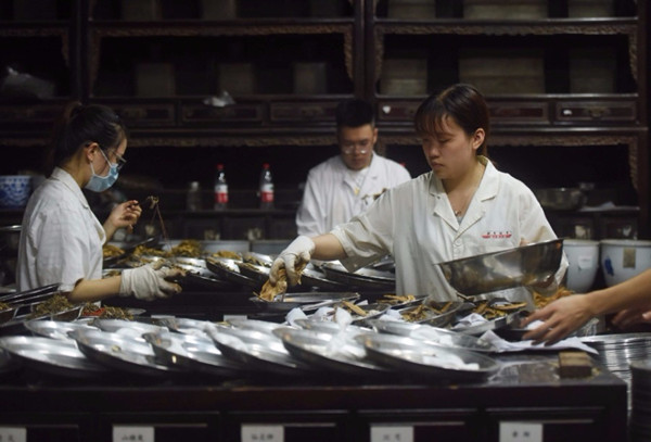 Staff members of a pharmacy fill prescriptions of Traditional Chinese Medicine for patients in Hangzhou, east China's Zhejiang province, May 26, 2019. [Photo/Xinhua]