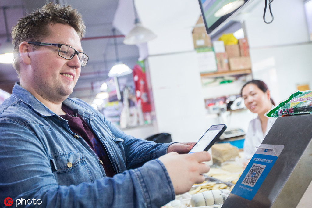 The 28-year-old German-born Thomas Derksen, an online celebrity with millions of Chinese fans on Weibo, Meipai and other social networks, scans a QR code via the mobile payment service Alipay of Alibaba Group on his smartphone to pay for his purchase at a market in Shanghai, June 22, 2017. [Photo/IC]
