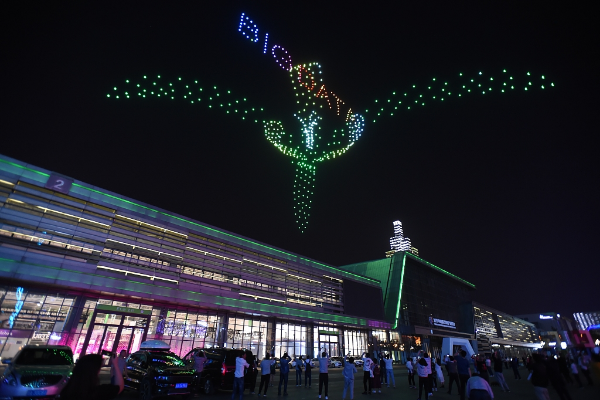 A total of 526 drones form the expo's logo in Guiyang, Guizhou province, on May 23, 2019. [Photo/VCG]