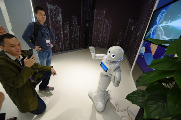 A visitor interacts with a robot with 5G technology at the China International Big Data Industry Expo 2019 in Guiyang, Guizhou province, on May 26, 2019. [Photo/Xinhua]