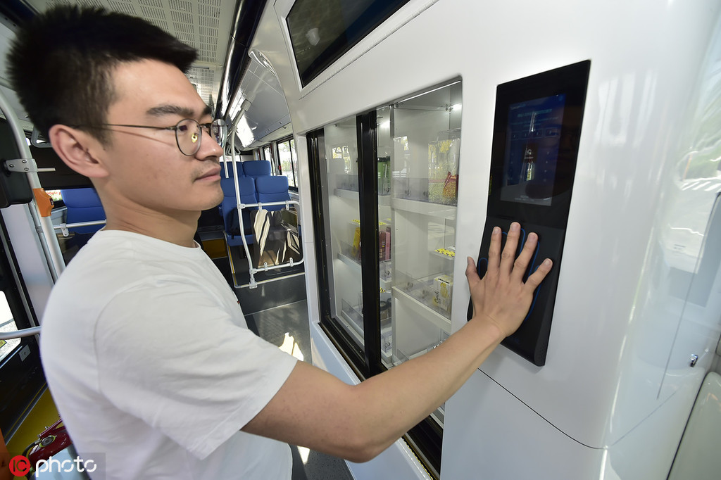 A passenger swipes his hand through a fingerprint recognition system to buy food on an AI-based "Panda Bus" in Tianjin, May 22, 2019. [Photo/IC]