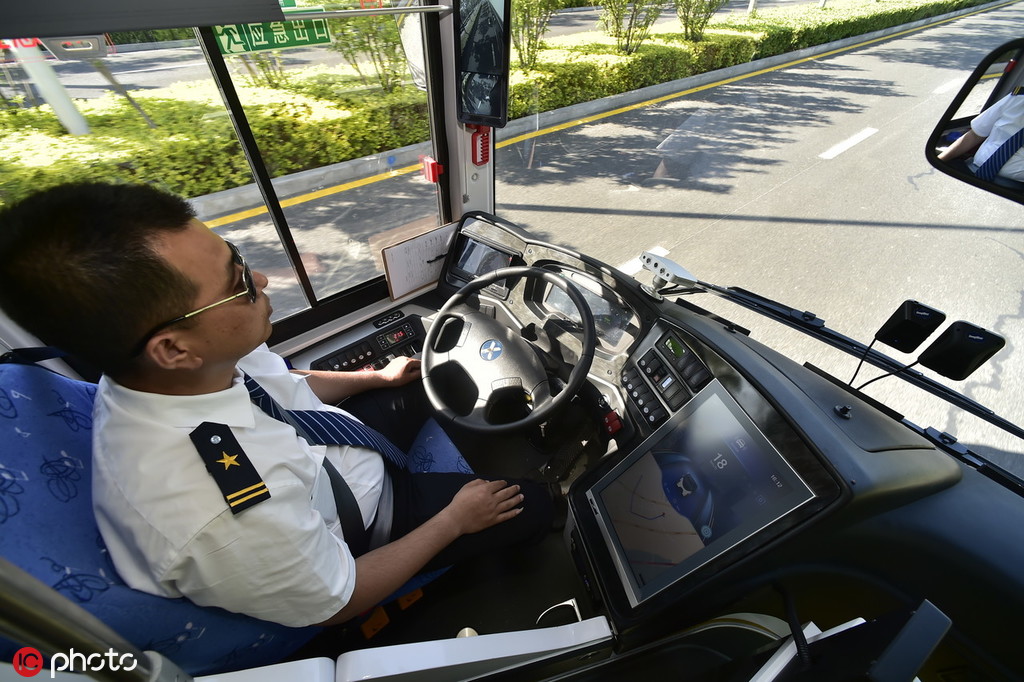 A driver operates an AI-based "Panda Bus" with his hands off the wheel on May 22, 2019. [Photo/IC]