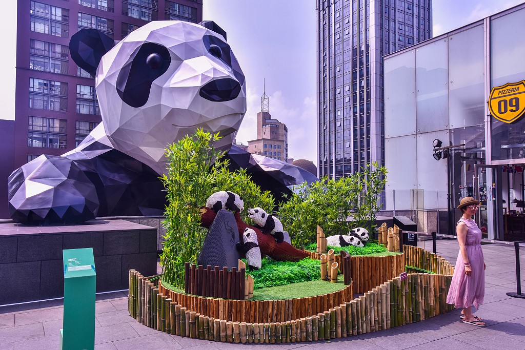 A 15-meter-tall panda sculpture at the Chengdu International Finance Square building is seen in Chengdu, Sichuan province on June 24, 2018. [Photo/VCG]
