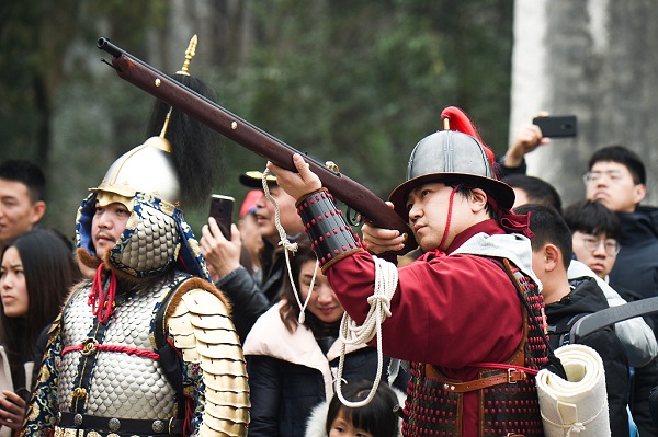 Actors dressed as army sergeants of the Ming Dynasty (1368-1644) perform on Nanjing Plum Blossom Mountain to allow visitors to feel the charm of traditional Chinese culture. [Photo/VCG]