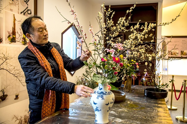 A flower arrangement exhibition is held during the 2019 International Plum Blossom Festival of Nanjing in Nanjing Plum Blossom Mountain. [Photo/VCG]