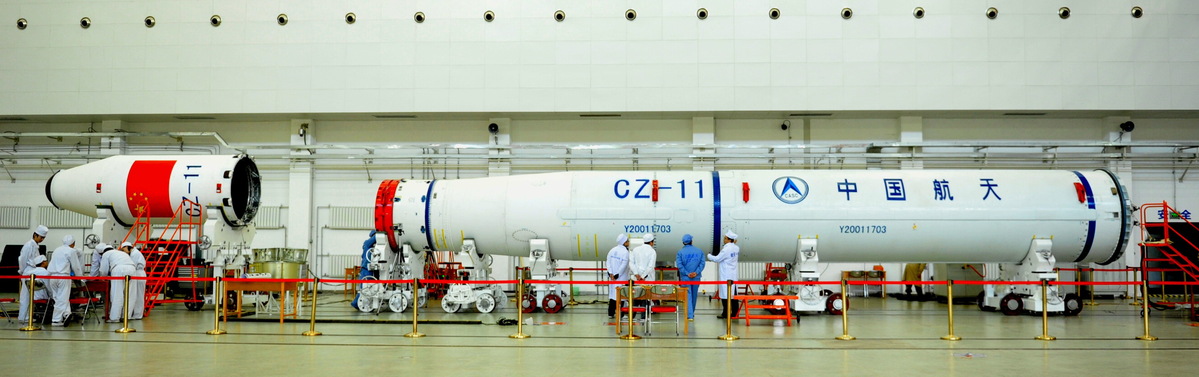 Engineers check sections of a Long March 11 carrier rocket at an assembly workshop of the China Academy of Launch Vehicle Technology in Beijing. [Photo provided to China Daily]